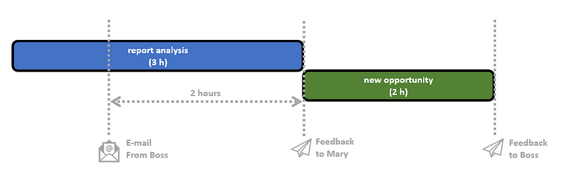 - How long did John’s boss wait for the new opportunity analysis? — the first feedback was sent after an hour, but since John’s analysis was incomplete, it was faulty. The complete and accurate feedback was sent 5 hours after John received the task.
