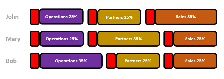 John is a member of three teams. His boss told him that he should allocate 30% of his time to the Operations team, 30% to the Partners team, and 40% to the Sales team. It’s a similar situation with Mary and Bob from his department, but with a different percentage. Sounds familiar?