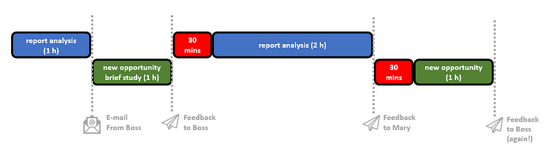 Notice the red parts. I’m sure that you’re experienced enough to agree that switching from one complex task to another is not easy. It often means that you have to spend some time reminding yourself about the things that you already did. It is the same with John, so he spends an additional 30 minutes reminding himself of his previous findings on the topic.