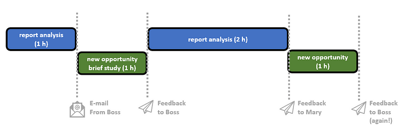 - How long did his boss wait for the new opportunity analysis? — the feedback was sent to his boss after 4 hours, without faulty intermediate feedback!