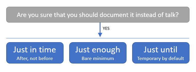 Think if you really need to document it, or can it be replaced with verbal communication? Remind yourself of agile principle that “face-to-face communication is the most efficient and effective method of transferring information.”